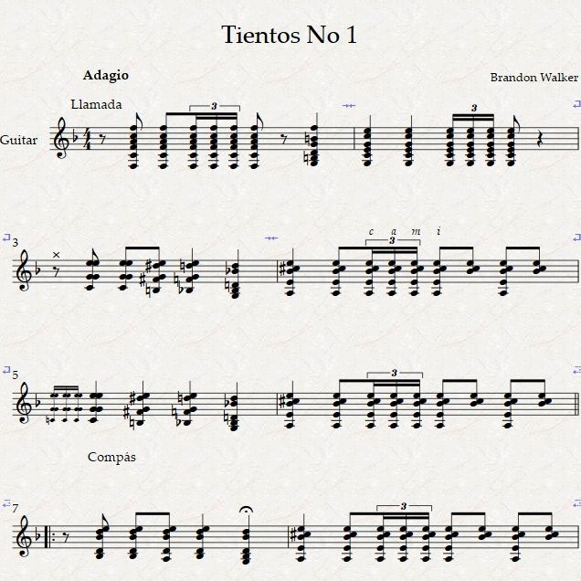 In my study of flamenco, I learned that although each ‘branch’ (palo) represents a unique form—with its own compás or rhythmic pattern, and a number of traditional features which identify each palo—many of the forms are thought of as existing on a continuum. In essence, while the Tientos has its unique characteristics, it is actually a slower form of the Tangos, which, in turn, is a slower form of the Rumba. When guitarist, dancer, singer and percussionist play in ensemble, it is common for a Tangos to climax with a short Rumba. As such, the Rumba is said to be the macho of the Tangos. The llamada is the part of each compás that announces the intent of the music to everyone on and off the stage.